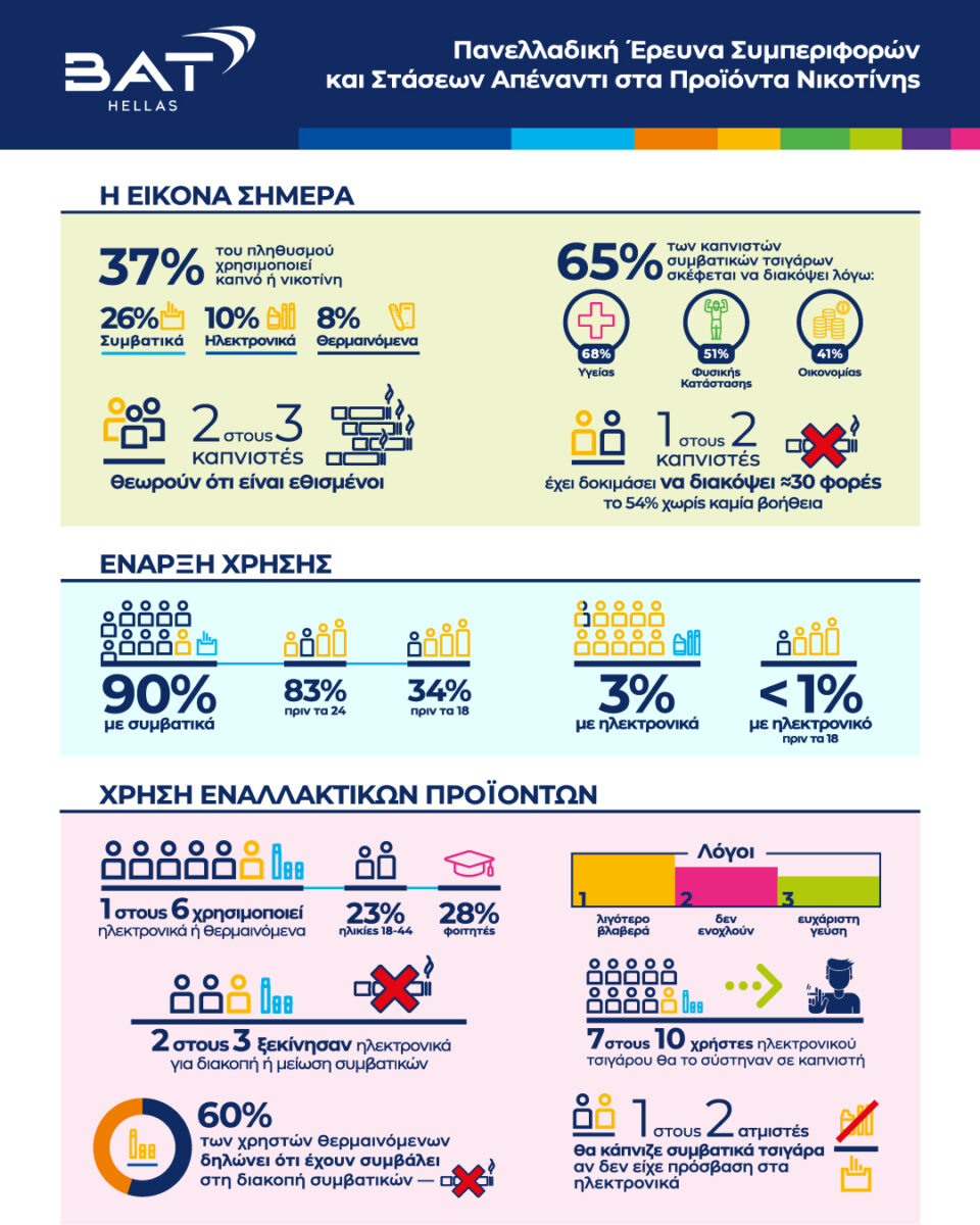 - 1 στους 2 καπνιστές συμβατικών τσιγάρων έχει δοκιμάσει να διακόψει το κάπνισμα περίπου 30 φορές, ενώ το 65% όσων καπνίζουν συμβατικά τσιγάρα σκέφτεται να διακόψει τη χρήση μελλοντικά λόγω φόβου για την υγεία, καλύτερης φυσικής κατάστασης και οικονομικών παραγόντων.