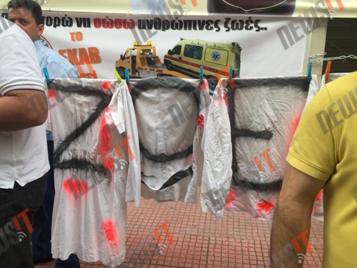 Συγκέντρωση διαμαρτυρίας έξω από το υπουργείο Υγείας με έναν πρωτότυπο τρόπο κάνει αυτή την ώρα η ΠΟΕΔΗΝ. Οι νοσηλευτές και οι απλήρωτες καθαρίστριες από το Δρομοκαϊτειο κρέμασαν ματωμένες μπλούζες έξω από το υπουργείο Υγείας. Πάνω στις μπλούζες γράφει: «Κινδυνεύουν ζωές στο ΕΣΥ».