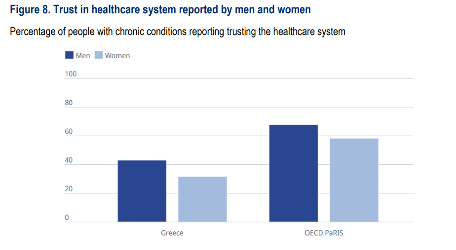 Η έλλειψη εμπιστοσύνης είναι ακόμη πιο έντονη στις γυναίκες, με μόλις 31% να δηλώνουν εμπιστοσύνη στο σύστημα υγείας, έναντι 43% των ανδρών.