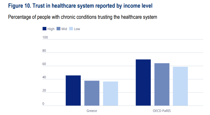 Το πιο ανησυχητικό εύρημα της έρευνας είναι η χαμηλή εμπιστοσύνη των ασθενών στο σύστημα υγείας. Μόνο 36% των Ελλήνων με χρόνια νοσήματα δηλώνουν ότι εμπιστεύονται το ΕΣΥ, τη στιγμή που ο μέσος όρος του ΟΟΣΑ είναι 62%.