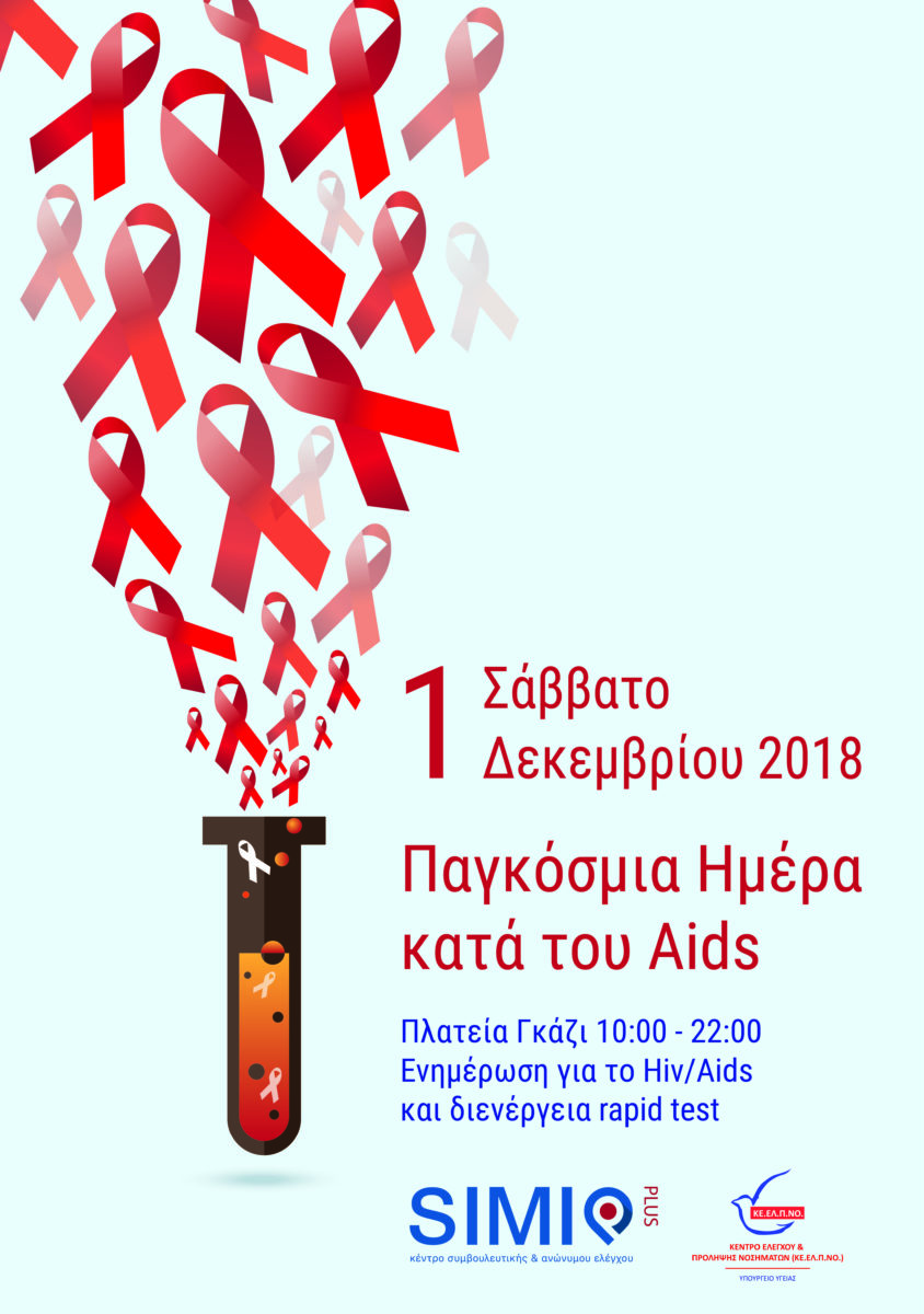 Κεντρική εκδήλωση στην πλατεία Κεραμικού στο Γκάζι την 1η Δεκεμβρίου 2018 (ωράριο 10:00-22:00), όπου θα λειτουργεί κινητή μονάδα με τη δυνατότητα διενέργειας Rapid test, με παροχή συμβουλών πριν και μετά το test και διανομή έντυπου υλικού. Παράλληλα, θα πραγματοποιηθούν τρεις παραστάσεις από πολυμελή ομάδα κρουστών.