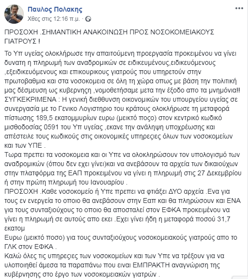 Παύλος Πολάκης για αναδρομικά: τα χρήματα πιστώθηκαν και τώρα πρέπει να «τρέξουν» ΥΠΕ και νοσοκομεία