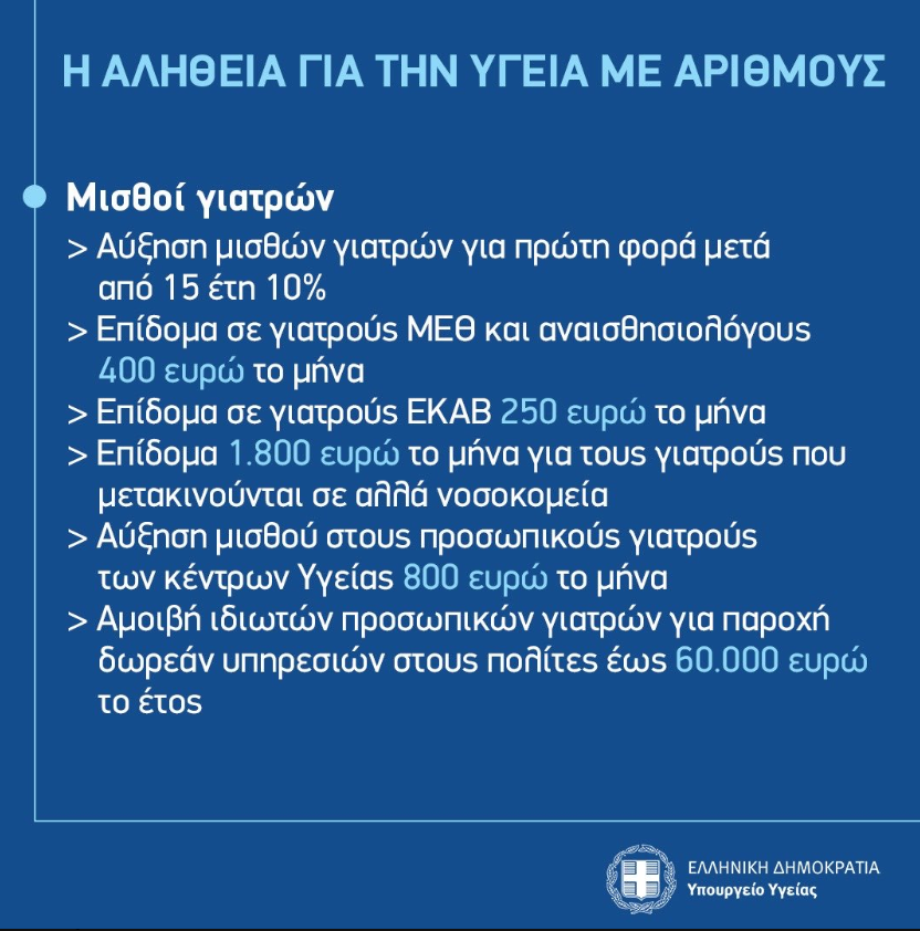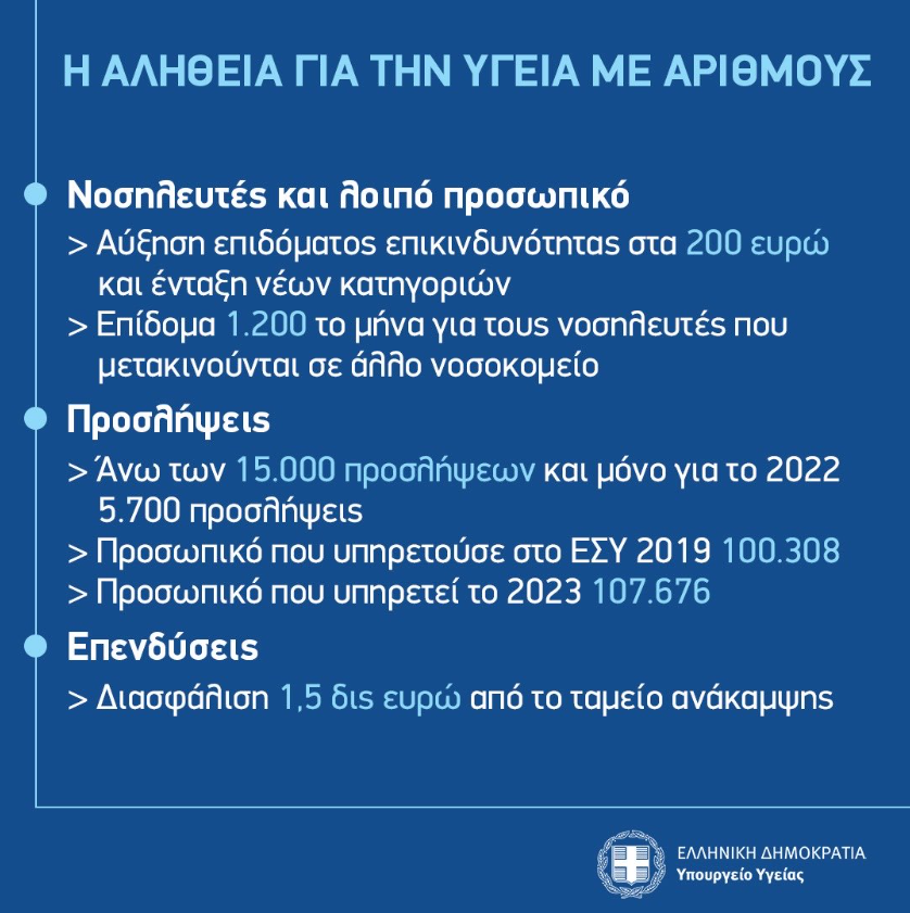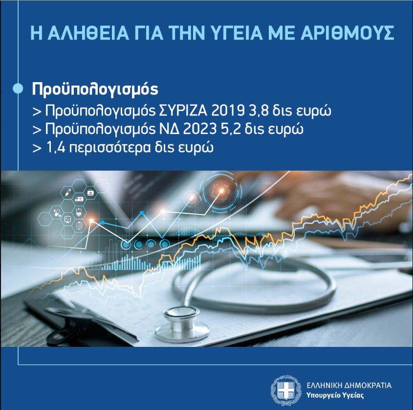Απαντώντας στον ΣΥΡΙΖΑ και τις εξαγγελίες του κόμματος για την Υγεία, απαντάει όπως λέει, «με την αλήθεια: 1,4 περισσότερα δισ. για την Υγεία, 1,5 δισ. για 80 ΤΕΠ και 156 κέντρα υγείας, 7.000 περισσότεροι εργαζόμενοι στο ΕΣΥ, 10% αύξηση στους μισθούς, θεσμοθέτηση προληπτικών εξετάσεων και προσωπικού γιατρού».