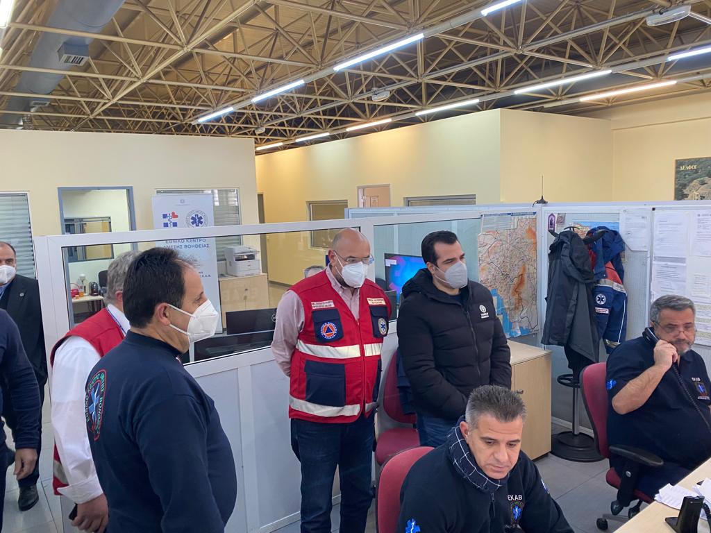 Ο κ. Πλεύρης ενημερώθηκε για τα προβλήματα προσβασιμότητας που αντιμετωπίζουν τα ασθενοφόρα του ΕΚΑΒ σε πολλά σημεία του οδικού δικτύου, στην προσπάθειά τους να εξυπηρετήσουν τη διακομιδή ασθενών. Παρά τις αγωνιώδεις προσπάθειες του Κέντρου Επιχειρήσεων και των πληρωμάτων, 80 κλήσεις πολιτών στις 12:00 το μεσημέρι βρίσκονταν σε αναμονή, καθώς τα ασθενοφόρα δεν μπορούσαν να προσεγγίσουν λόγω του χιονιού.