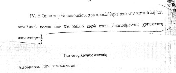 Ο Γενικός Επίτροπος του Ελεγκτικού Συνεδρίου και όχι το νοσοκομείο Λάρισας αιτείται να καταλογισθούν από το IV τμήμα του Ελεγκτικού στον γιατρό 850.666,66 ευρώ αν και καταδικάστηκε για απλή αμέλεια και όχι βαριά αμέλεια όπως ορίζουν οι νόμοι, αναφέρει η ΠΟΕΔΗΝ: