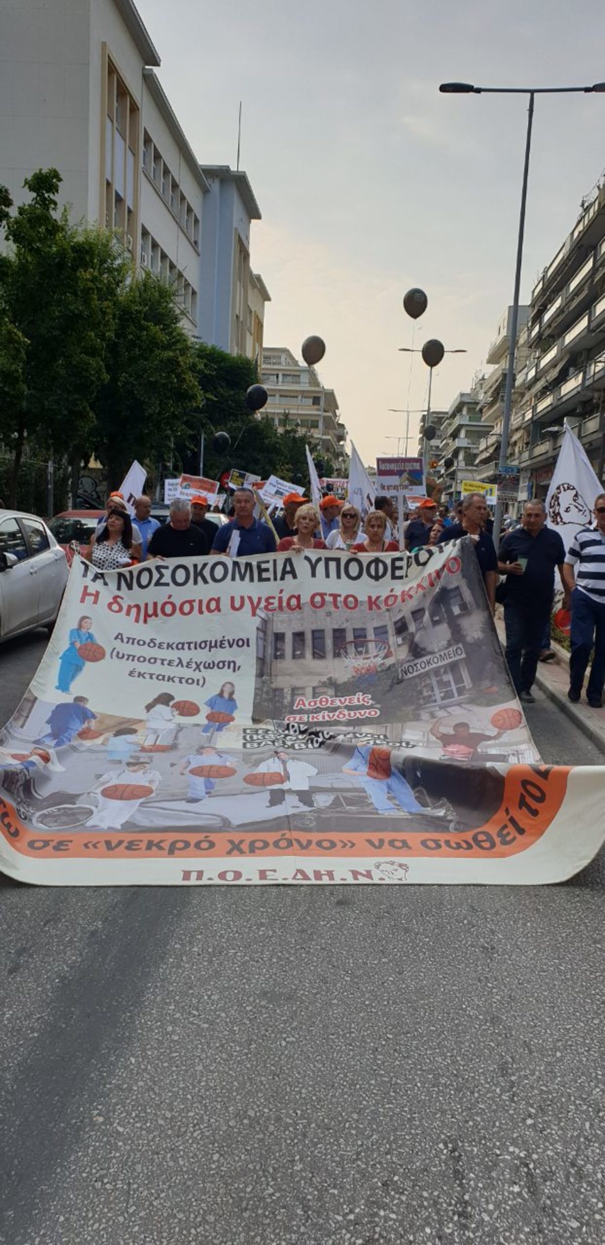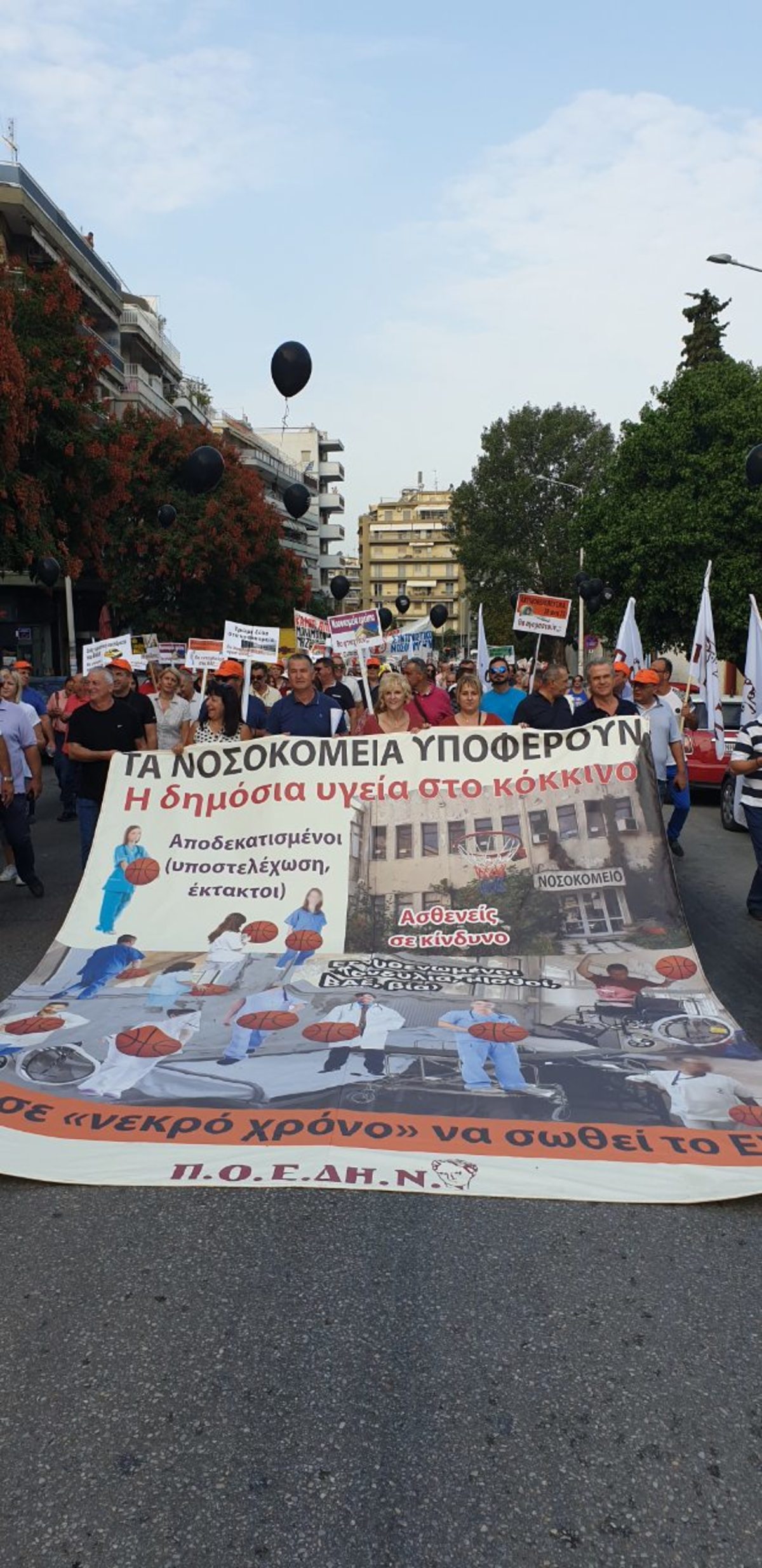 Πορεία «Σωτηρίας της Δημοσιας Υγείας» πραγματοποίησε σήμερα με αφορμή την 84η Διεθνή ‘Εκθεση Θεσσαλονίκης (ΔΕΘ), η Πανελλήνια Ομοσπονδία στα Δημόσια Νοσοκομεία (ΠΟΕΔΗΝ), με τη συμμετοχή δεκάδων εργαζομένων στη Δημόσια Υγεία.
