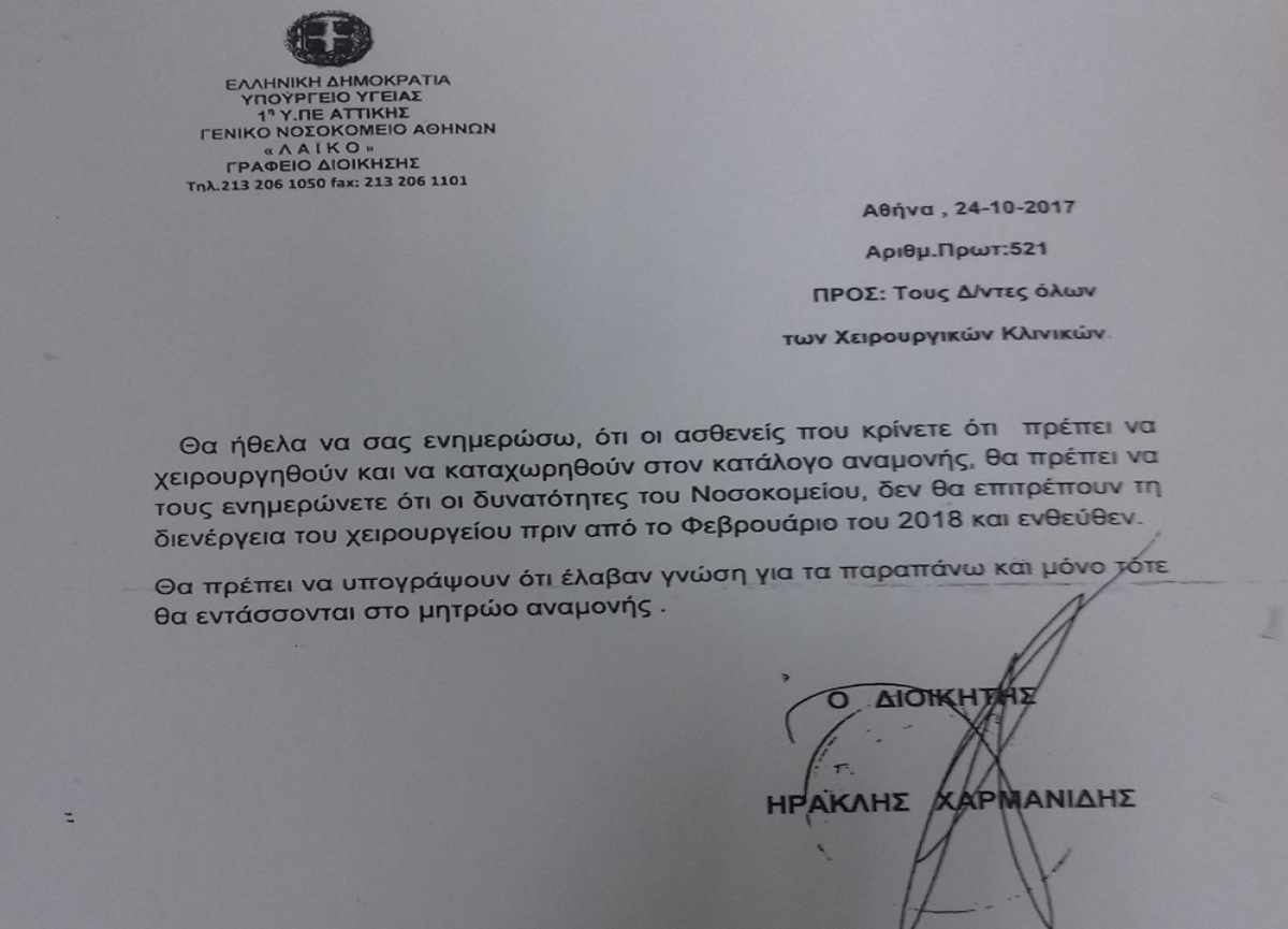 Με έγγραφό του, ο Διοικητής του Νοσοκομείου προς τους Διευθυντές όλων των Χειρουργικών Κλινικών, τους ενημερώνει ότι οι Ασθενείς που κρίνονται ότι πρέπει να χειρουργηθούν και να καταχωρηθούν στον κατάλογο αναμονής, θα πρέπει να τους ενημερώνετε ότι οι δυνατότητες του Νοσοκομείου δεν θα επιτρέπουν την διενέργεια χειρουργείων πριν τον Φεβρουάριο του έτους 2018 και εντεύθεν.