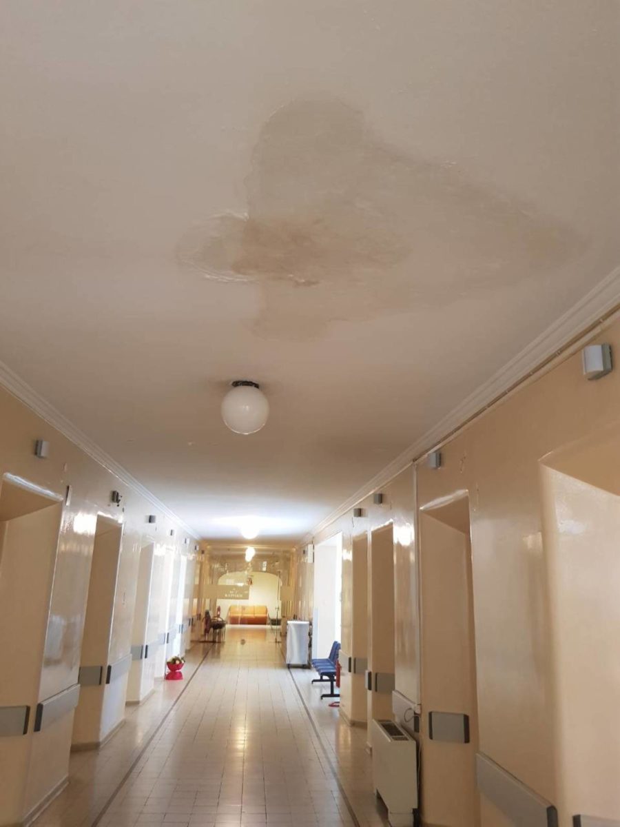 Τα σκουριασμένα κλιματιστικά που δείξαμε το καλοκαίρι και τρέχουν νερά παραμένουν. Όλο το Νοσοκομείο στάζει. Πρέπει για να μην βραχείς να κρατάς ομπρέλα στους θαλάμους ασθενών και τους διαδρόμους.