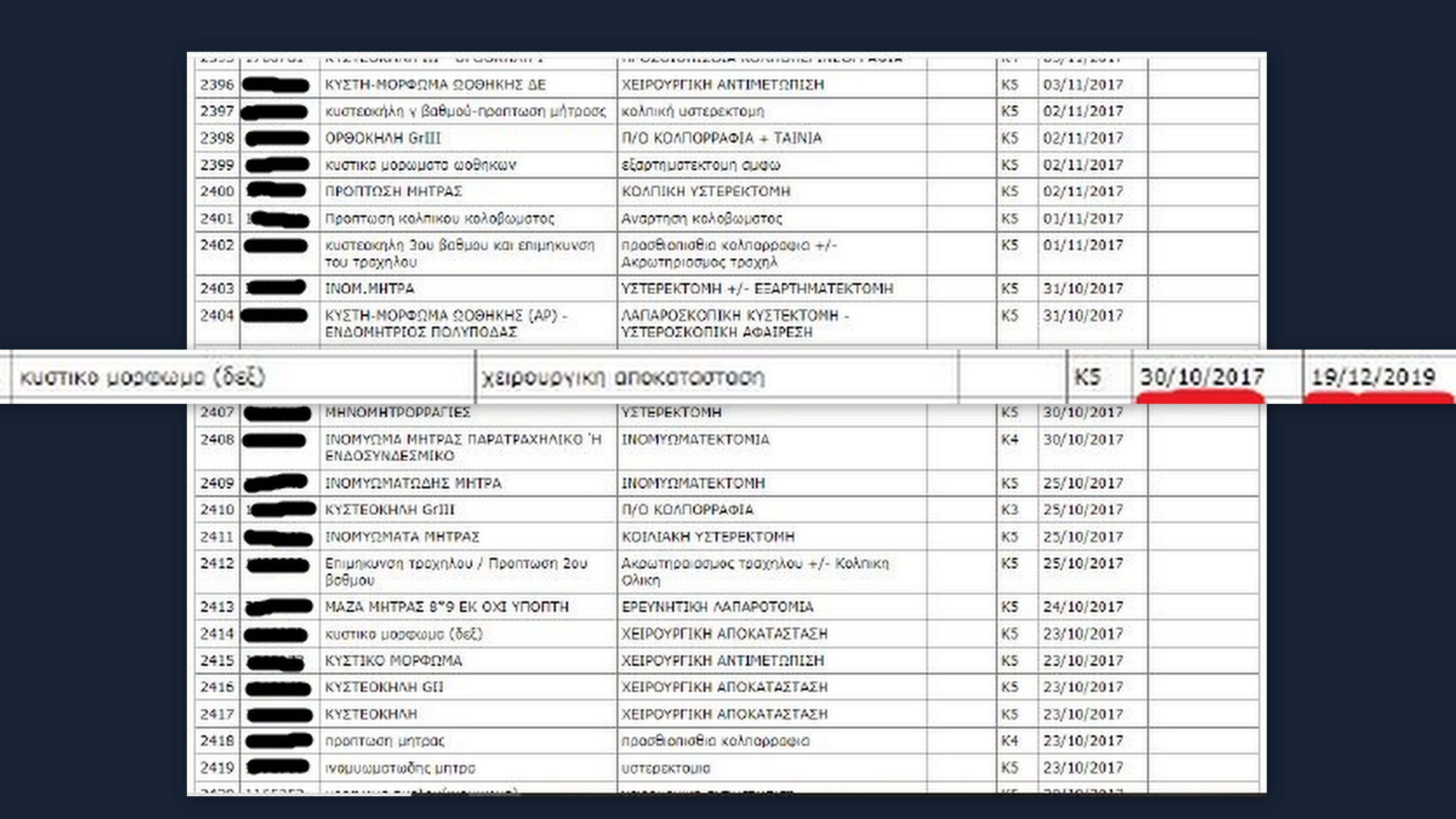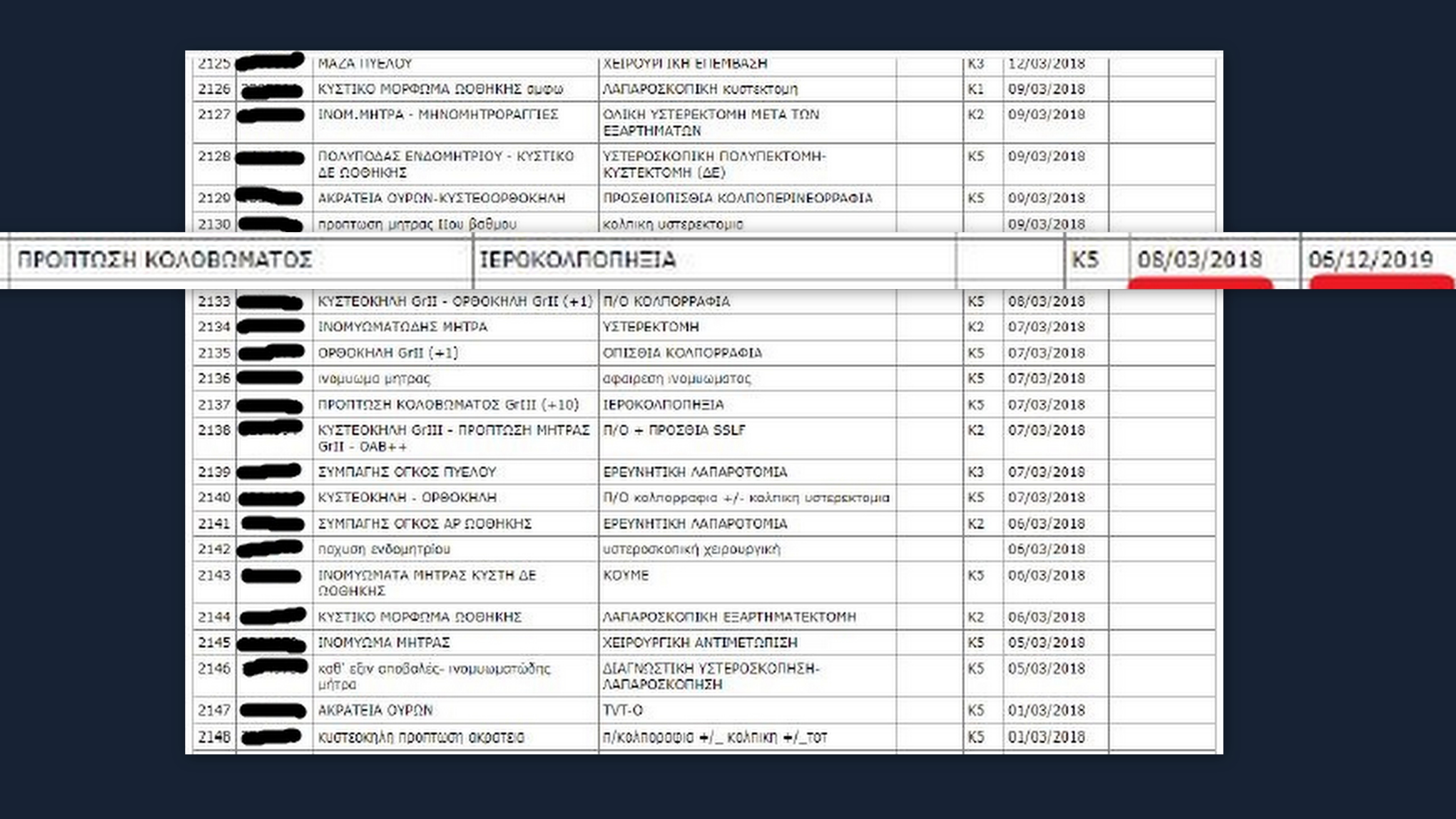 Στη λίστα που ακολουθεί, θα διαπιστώσετε ότι η αναμονή, όπως υποστηρίζει η ΠΟΕΔΗΝ, για σοβαρά χειρουργεία αγγίζει τα δύο χρόνια. Η προτελευταία στήλη είναι ημερομηνία διάγνωσης και εγγραφής στη λίστα και η τελευταία στήλη, η ημερομηνία που πραγματοποιήθηκε το χειρουργείο.