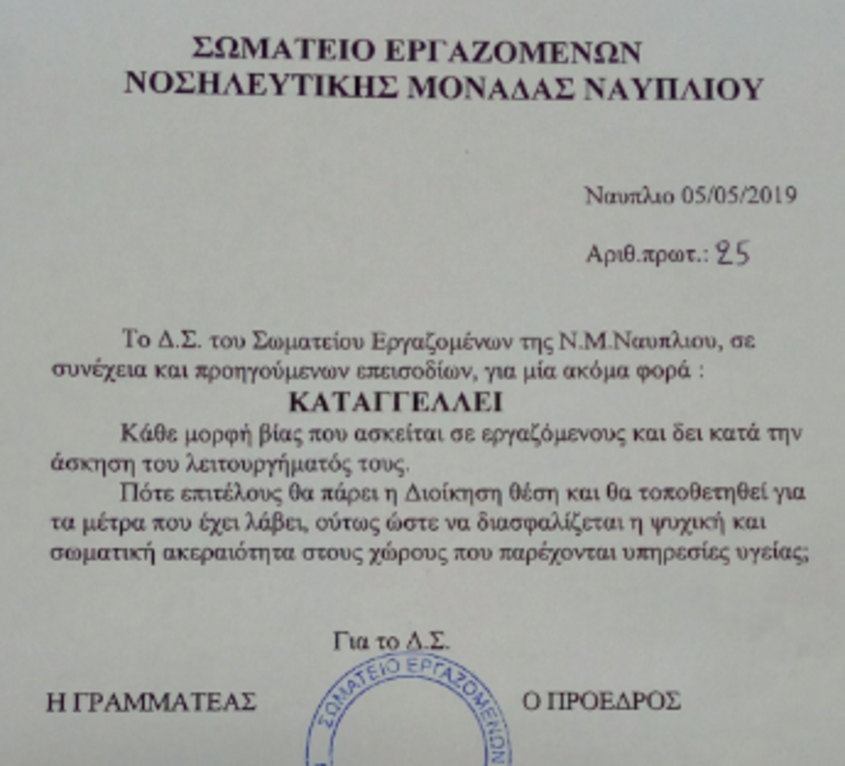Το Σάββατο 4/5/2019 στις 4μμ. στο Νοσοκομείο Ναυπλίου, πολίτης έφερε σε φορτηγάκι πάνω στην καρότσα την έγκυο σύζυγό του που αιμορραγούσε. Ο τραυματιοφορέας που ανέλαβε τη διακομιδή έφαγε άγριο ξύλο από τον σύζυγο. Παρά ταύτα τραυματισμένος την μετέφερε στο ΤΕΠ. Κλήθηκε η αστυνομία, αλλά όταν έφθασε εκεί εξαφανίστηκε ο δράστης. Εμφανίστηκε ως κύριος τρεις ώρες μετά , υπέγραψε και πήρε την σύζυγό του. Ούτε γάτα, ούτε ζημιά. Η Διοίκηση απούσα, τίποτα. Δεν επέβαλε μήνυση. Γι’ αυτό και δεν συνελήφθη ο δράστης παρ’ ότι έγινε επικοινωνία του γιατρού με τον εισαγγελέα. Εκείνη την ώρα στο Νοσοκομείο ήταν συγκεντρωμένοι πάρα πολλοί πολίτες για άλλο περιστατικό.