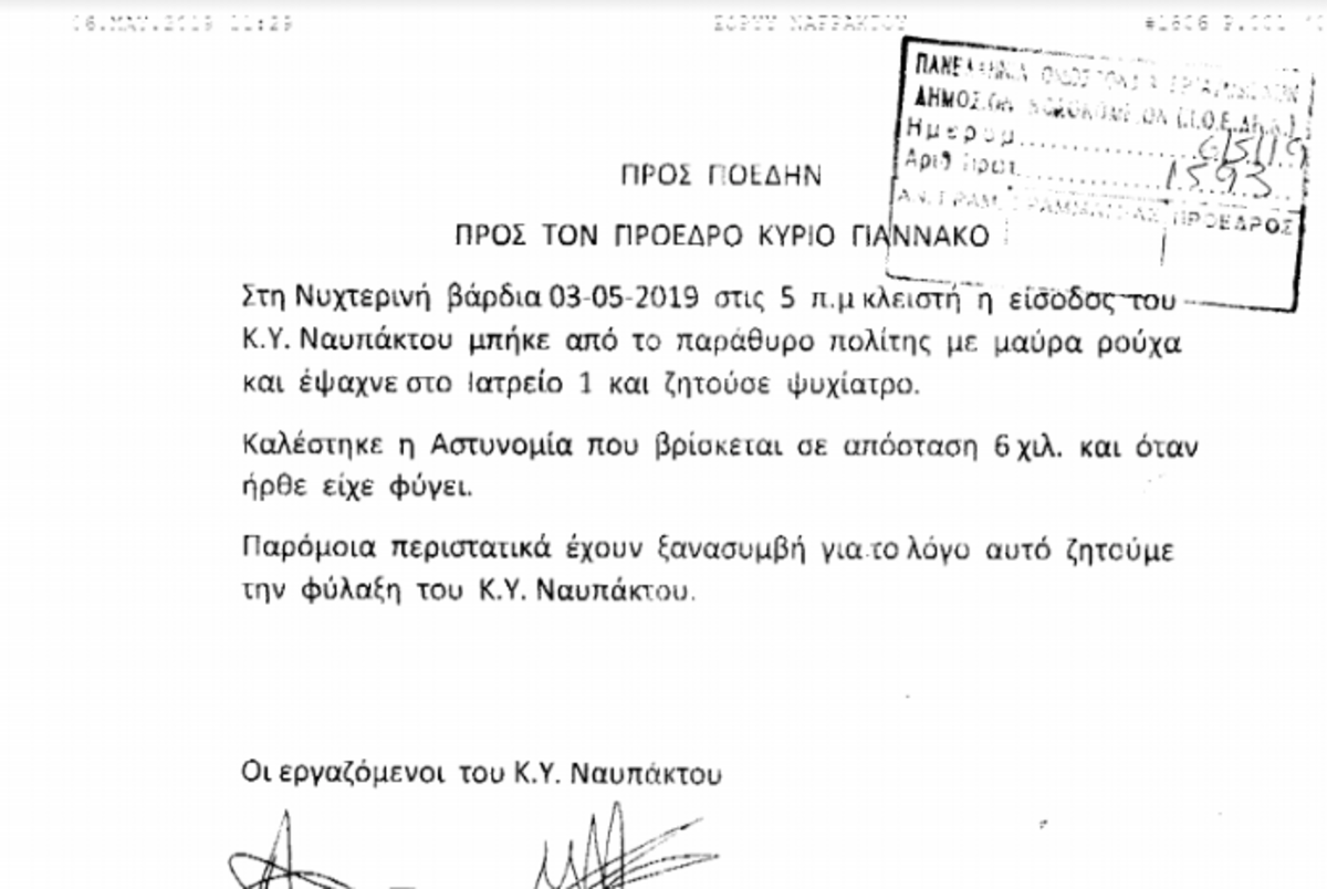Στην Ναύπακτο άτομο το Σάββατο το πρωί 4/5, μπήκε από το παράθυρο του Κέντρου Υγείας για να κλέψει φάρμακα. Απείλησε το Προσωπικό. Κλήθηκε η αστυνομία έως ότου φθάσει εξαφανίσθηκε ο δράσης. Καμία κίνηση από την 6ης ΥΠΕ.