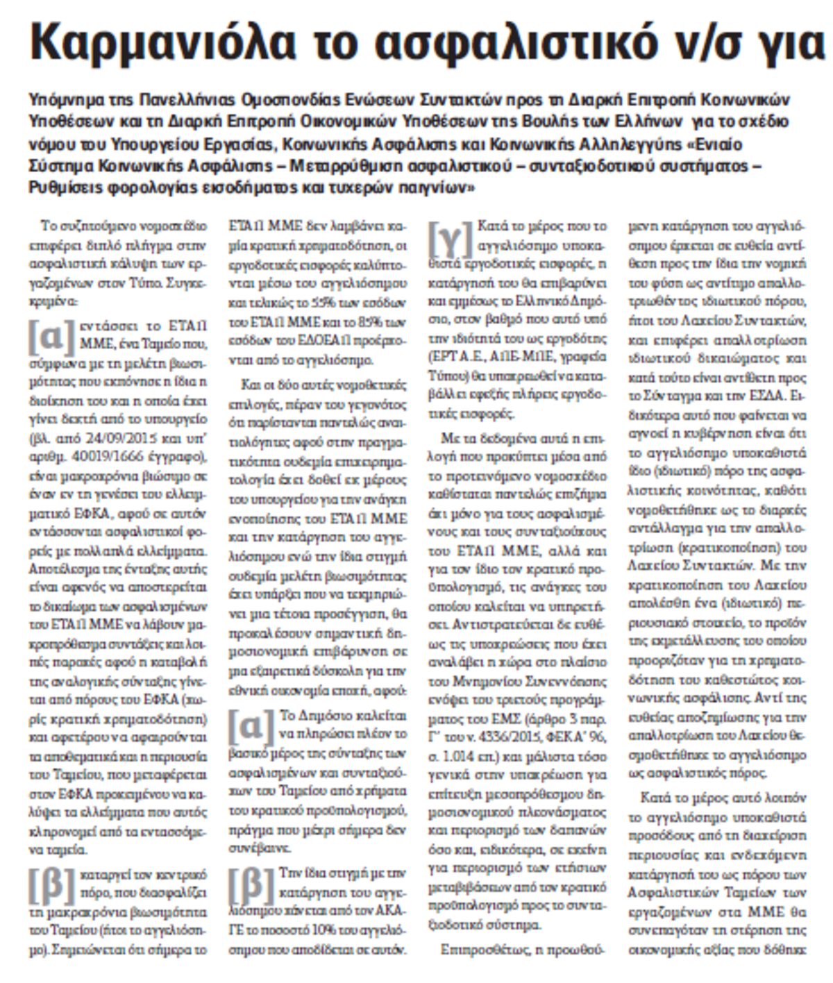 ΠΟΕΣΥ: «Καρμανιόλα» το νέο ασφαλιστικό!