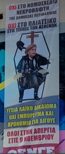 Το επίμαχο πανό που απεικονίζει τη Μίνα Γκάγκα, είχε κεντρικό σύνθημα: » Όχι στο νομοσχέδιο νεκροθάφτη της δημόσιας περίθαλψης. Όχι στο πλιάτσικο στις τσέπες των ασθενών. Υγεία λαϊκό δικαίωμα όχι εμπόρευμα και προνόμιο για λίγους».