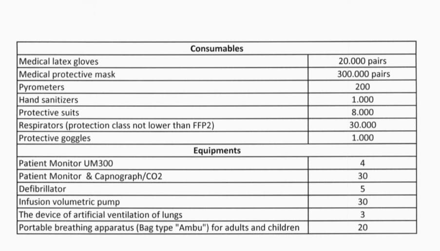 Στην Ουκρανία αναμένεται να σταλούν από την Ελλάδα – μεταξύ άλλων – μάσκες, γάντια, αντισηπτικά, προστατευτικές στολές και γυαλιά για το ιατρονοσηλευτικό προσωπικό, καθώς και μηχανήματα παρακολούθησης για την κλινική κατάσταση των ασθενών.