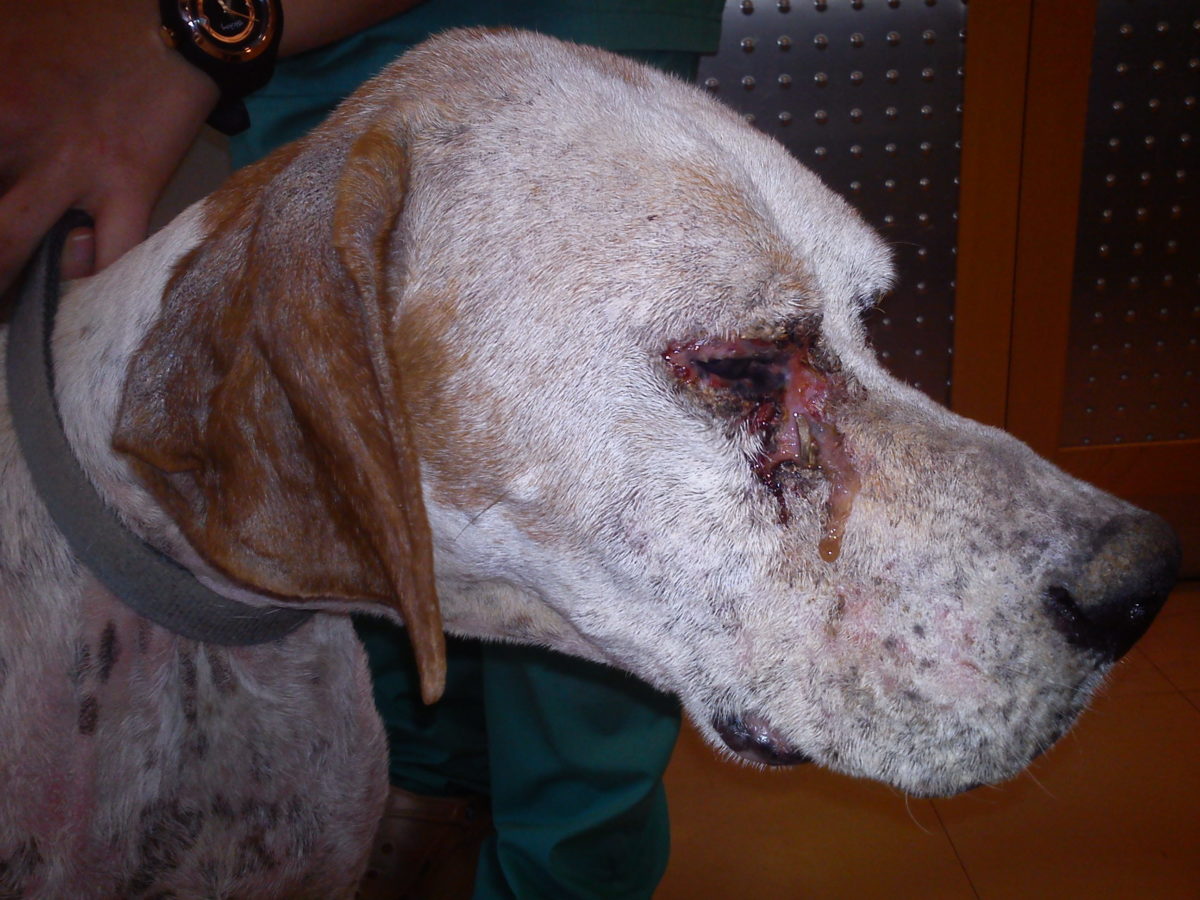 Η δερματική/βλεννογονοδερματική Λεϊσμανίαση εμφανίζεται με μικρότερη συχνότητα στα κυνοειδή, συνήθως με τη μορφή ενός ή πολλαπλών μικρών οζιδίων ή ελκών στο δέρμα ή στους βλεννογόνους με συνηθέστερη εντόπιση την κεφαλή (εικόνα 1). Αλλοιώσεις μπορεί όμως να εντοπιστούν σε πολλά σημεία του σώματος, ακόμη και μέσα στην στοματική κοιλότητα. Οι αλλοιώσεις μπορεί να υποχωρήσουν μετά την πάροδο μηνών αφήνοντας μια ουλή ή η νόσος να εξελιχθεί στην γενικευμένη, σπλαχνική μορφή.