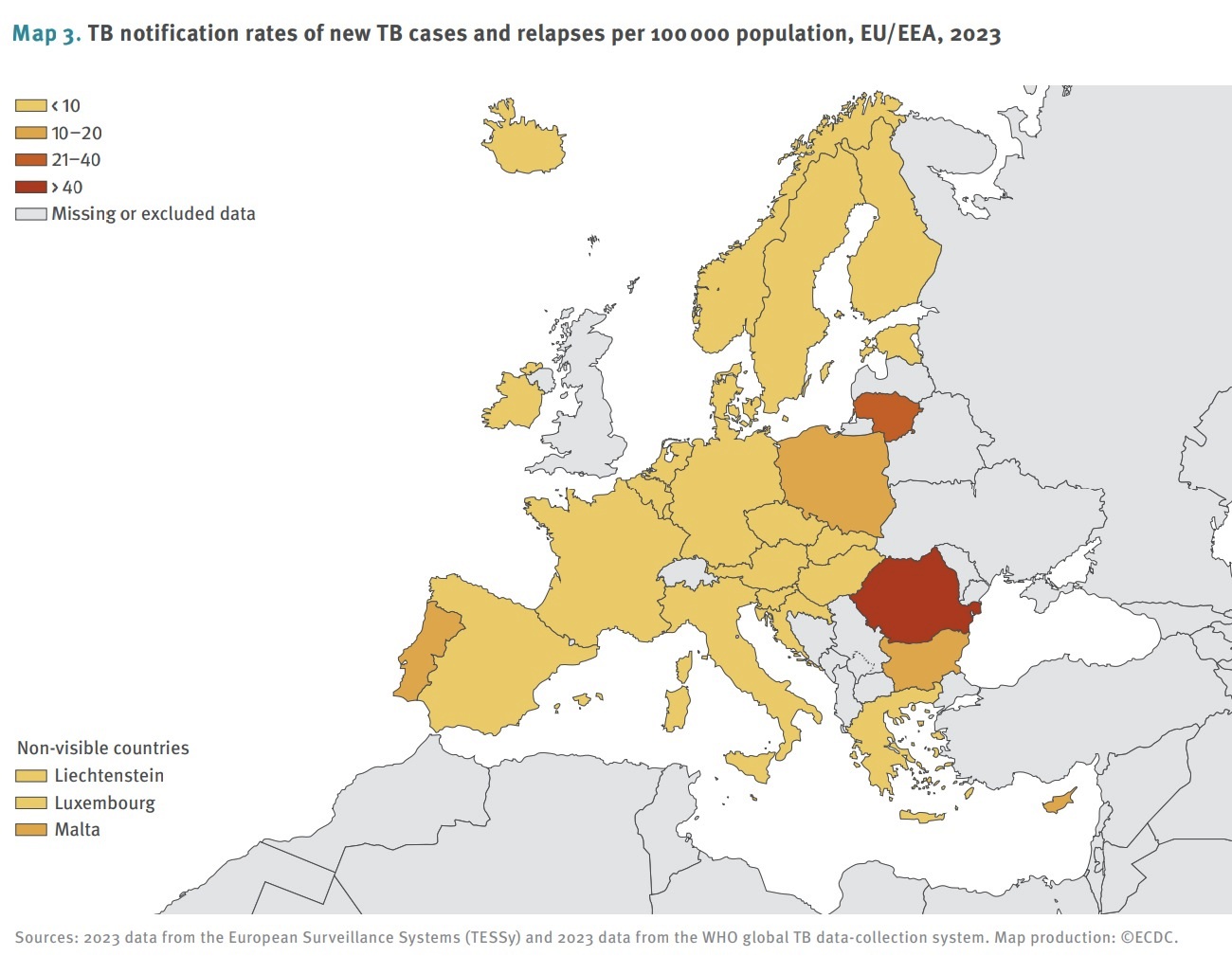 Σύμφωνα με τη νέα έκθεση, η Ελλάδα είναι μία από τις τέσσερις χώρες της ΕΕ/ΕΟΧ όπου η φυματίωση προκαλεί περισσότερα κρούσματα απ’ ό,τι πριν την πανδημία. Η αύξηση ήταν το 2023 της τάξης του 1% έως 3% σε σύγκριση με το 2019. Οι άλλες τρεις χώρες όπου επίσης παρατηρείται αύξηση είναι οι:
