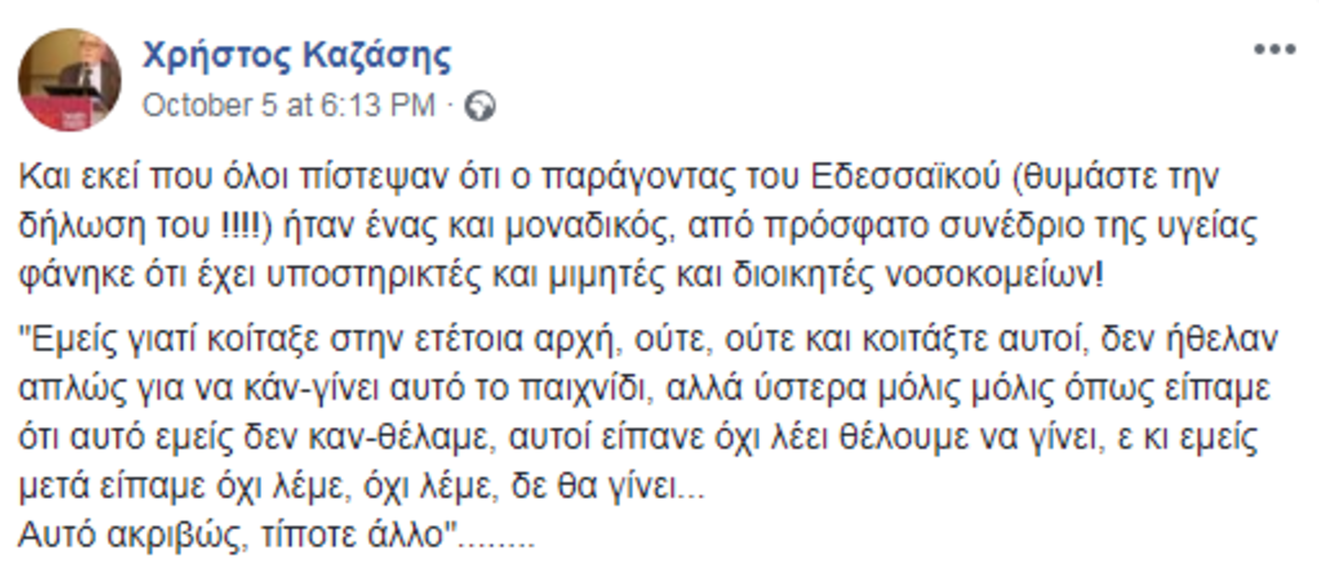 Ο κ. Χρήστος Καζάσης έχει σπουδάσει Εμβιομηχανική και Αξιολόγηση Ιατρικής Τεχνολογίας και θεωρείται expert στα θέματα αυτά. Δείτε τι σχολίασε χθες βράδυ στο λογαριασμό του στο facebook το οποίο μεταδίδουμε μετά από δική του, έγγραφη συγκατάθεση: