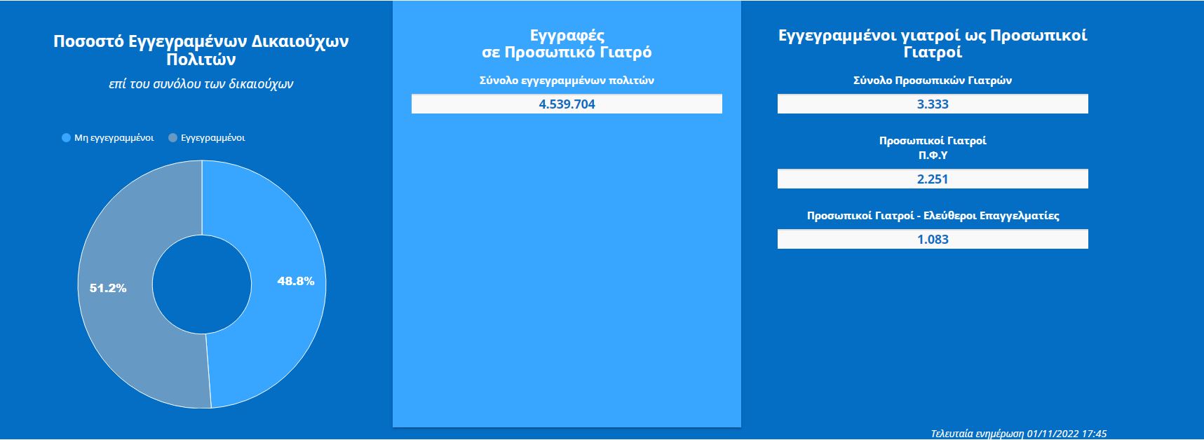 Από τα στατιστικά της ιστοσελίδας prosopikos.gov.gr μαθαίνουμε πως συνολικά έχουν εγγραφεί στον θεσμό του προσωπικού γιατρού, μέχρι σήμερα Τρίτη (8/11/2022) 4.539.704 πολίτες και 3.333 γιατροί.