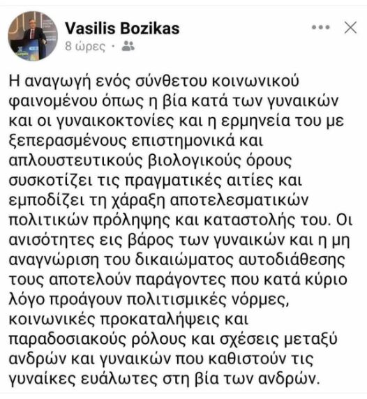 Ο πρόεδρος της Ελληνικής Ψυχιατρικής Εταιρείας, Βασίλης Μποζίκας, υπογράφει ανάρτηση στην οποία μιλά για «ξεπερασμένους επιστημονικά και απλουστευτικούς βιολογικούς όρους», απαντώντας στις δηλώσεις του υφυπουργού Υγείας, ότι οι γυναικοκτονίες ενδέχεται να έχουν και … βιολογική βάση.