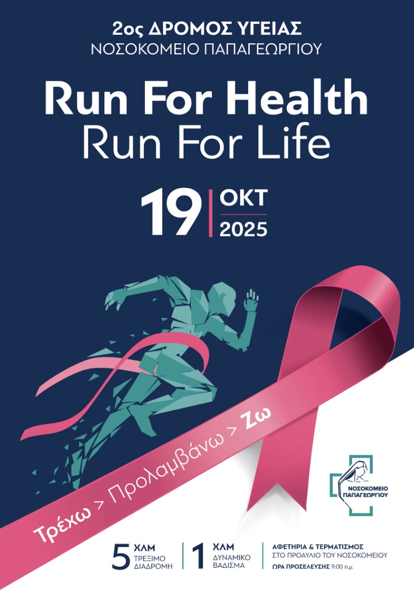 Αφιερωμένος στην πρόληψη και τη φροντίδα του καρκίνου είναι ο 2ος Δρόμος Υγείας «Run For Ηealth, Run For Life», που διοργανώνει την Κυριακή 19 Οκτωβρίου το νοσοκομείο Παπαγεωργίου.