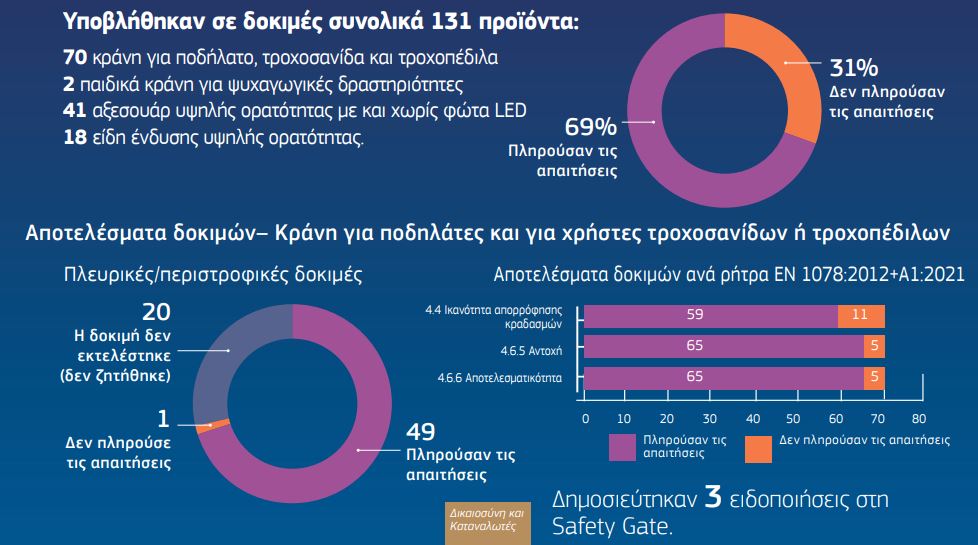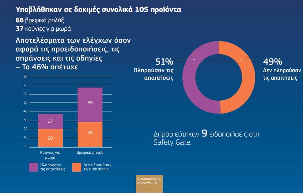Στην παραπάνω κατηγορία υποβλήθηκαν σε δοκιμές συνολικά 131 προϊόντα και από αυτά το 31% (σχεδόν τα 3 στα 10) βρέθηκε πως δεν πληρούσε τις προδιαγραφές ασφαλείας.