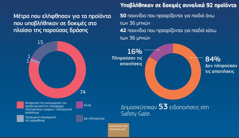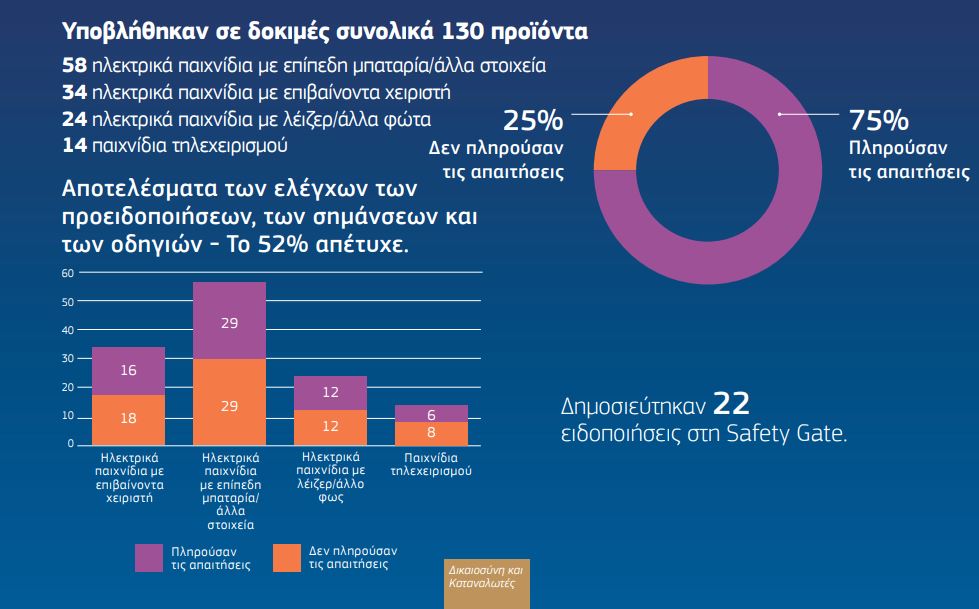 Στην κατηγορία «Παιδικά Παιχνίδια», από τα 92 προϊόντα που εξετάστηκαν βρέθηκε πως το 84%, δηλαδή περισσότερα από 8 στα 10, δεν πληρούσαν τις προδιαγραφές και απαιτήσεις ασφαλείας.