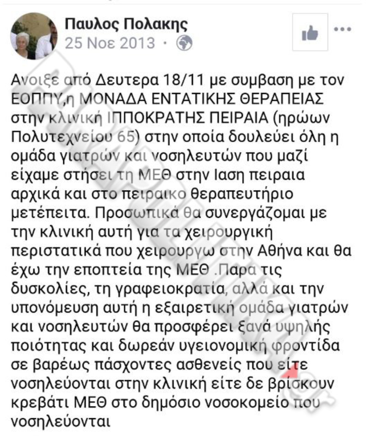 Αν και η είδηση της απόλυσης της νοσηλεύτριας με «δάκτυλο Πολάκη» χαρακτηρίστηκε ως «γαλάζιο fake news» από μερίδα του τύπου, τα Παραπολιτικά επιμένουν ότι η ανάρτηση του αναπληρωτή Υπουργού το 2013, με την οποία διαφήμιζε την έναρξη λειτουργίας της συγκεκριμένης ιδιωτικής κλινικής (και την οποία φρόντισε να «κατεβάσει» από τη σελίδα του στο facebook όπως αναφέρεται), αποδεικνύει τη στενή συνεργασία του Παύλου Πολάκη με την κλινική «Ιπποκράτης».