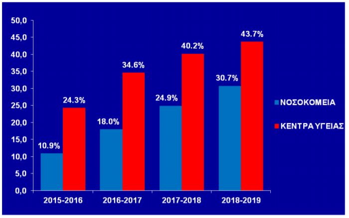 Από το 11% εμβολιαστικής κάλυψης στα νοσοκομεία και 24% στα Κέντρα Υγείας που σημειώθηκε το 2014-15, φτάσαμε στο 30.6% στα νοσοκομεία και 43,8% στα Κέντρα Πρωτοβάθμιας Φροντίδας Υγείας κατά την εμβολιαστική περίοδο της γρίπης 2018-2019.