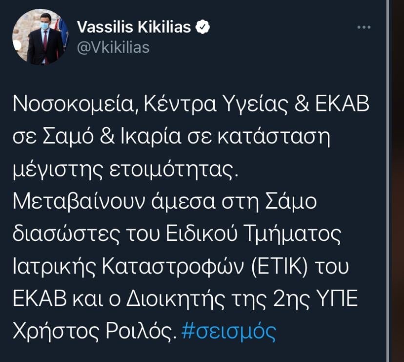 Για την ετοιμότητα του συστήματος Υγείας να προσφέρει κάθε υγειονομική βοήθεια στο νησί της Σάμου, ενημέρωσε με ανάρτησή του στα κοινωνικά δίκτυα, ο υπουργός Υγείας, Βασίλης Κικίλιας.