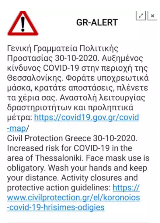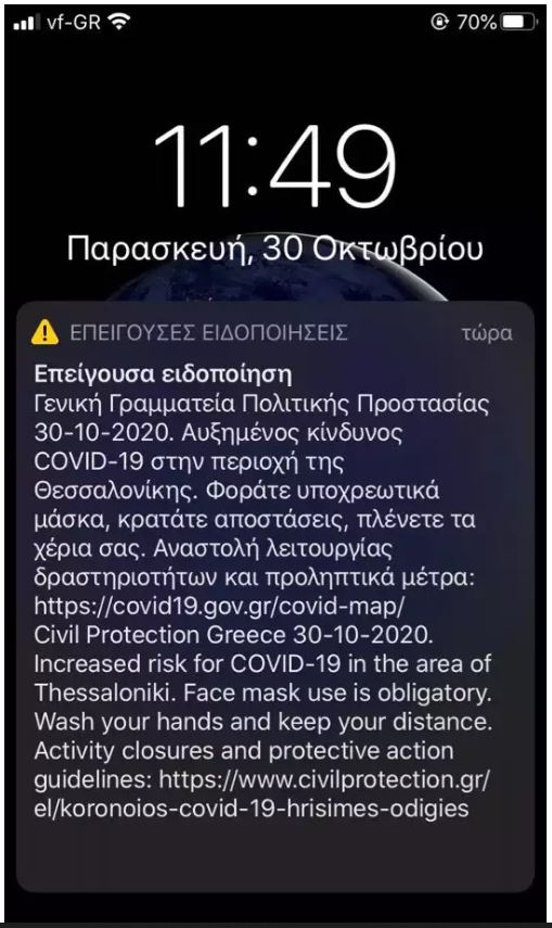 Μήνυμα από το 112 έλαβαν όσοι βρίσκονται στη Θεσσαλονίκη. Το μήνυμα από το 112 κάνει λόγο για αυξημένο κίνδυνο κορoνοϊού στην περιοχή της Θεσσαλονίκης και απευθύνει έκκληση στους πολίτες να φορούν μάσκα, να κρατούν αποστάσεις και να πλένουν τα χέρια τους.