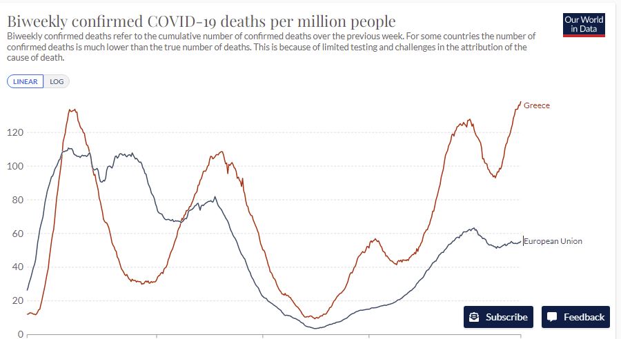 Στην τρίτη θέση της ΕΕ σε θανάτους Covid-19 η Ελλάδα – Τριπλάσια ποσοστά από τον ευρωπαϊκό μέσο όρο