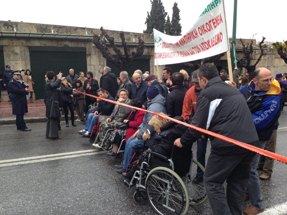 Δεκάδες ανάπηροι συγκεντρώθηκαν το πρωί έξω από το υπουργείο Οικονομικών προκειμένου να εκφράσουν την έντονη διαμαρτυρία τους στην πολιτική της κυβέρνησης. Εκπρόσωποι του κινήματος συναντήθηκαν με τον Διευθυντή του Γραφείου του υπουργού Οικονομικών αλλά οι απαντήσεις που πήραν δεν τους ικανοποίησαν.
