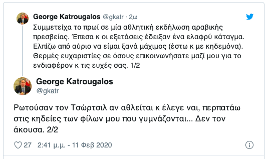 Διατηρώντας το χιούμορ του, παρά αυτή την περιπέτεια με την υγεία του, ο Γιώργος Κατρούγκαλος έγραψε: