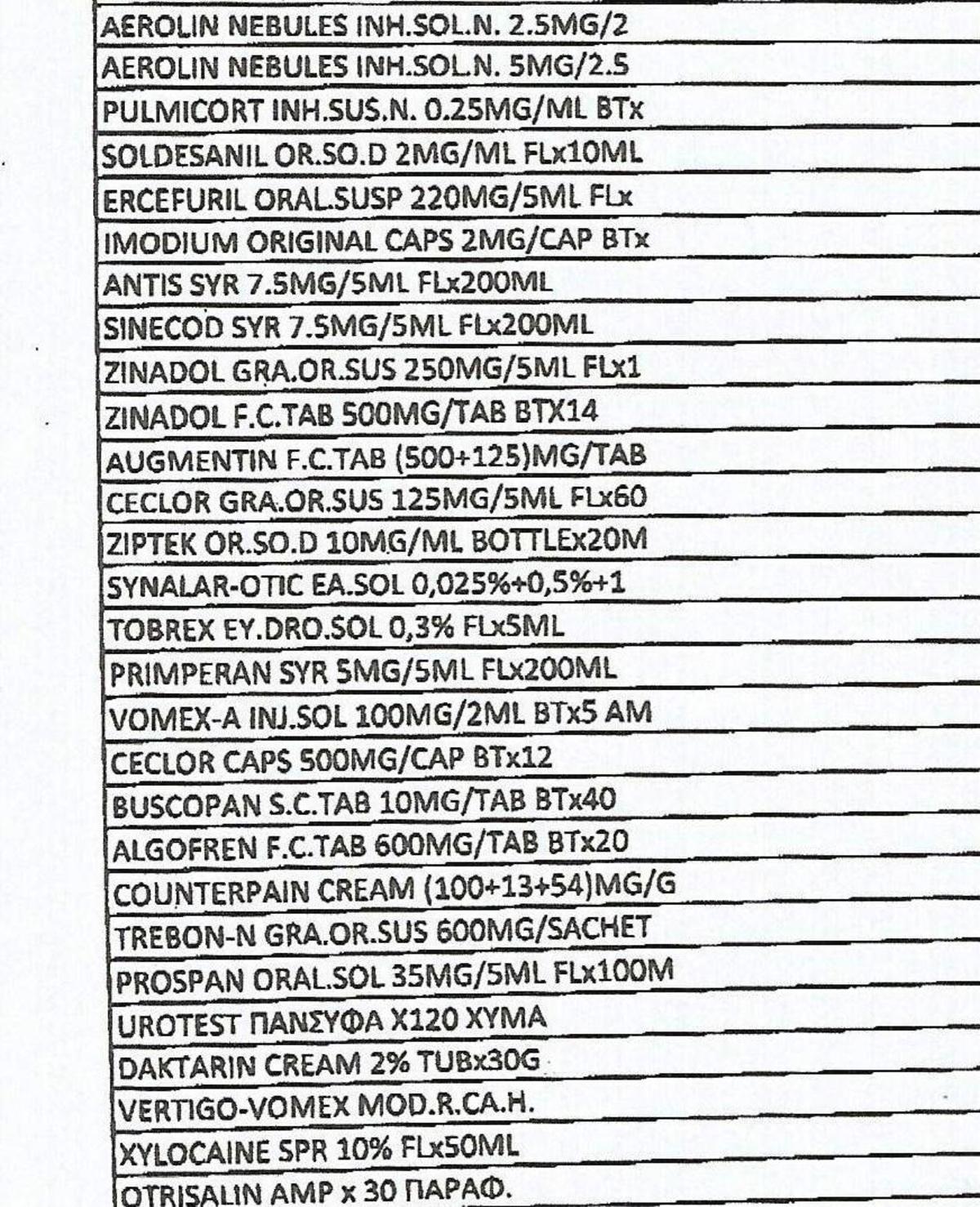 Προέκυψε η ανάγκη προσφοράς ορισμένων φαρμάκων, τόσο για ενήλικες όσο και για παιδιά. Ο κατάλογος των φαρμάκων που απαιτούνται δόθηκε από τον Ερυθρό Σταυρό και δημοσιεύεται παρακάτω.