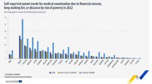 Σύμφωνα με τα στοιχεία αυτά, την περυσινή χρονιά, σε επίπεδο Ευρωπαϊκής Ένωσης, το ποσοστό των ανθρώπων που έπρεπε να κάνουν ιατρικές εξετάσεις και δεν μπορούσαν για οικονομικούς λόγους, επειδή υπήρχαν μεγάλες λίστες αναμονής ή λόγω απόστασης ήταν 3,3%.