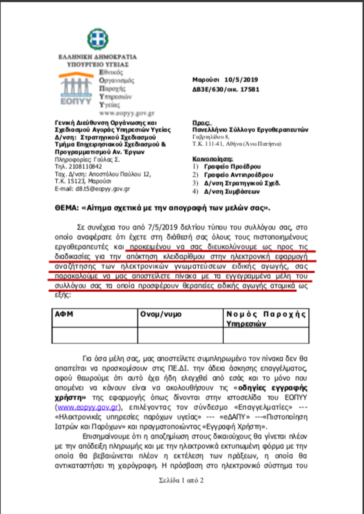 Εργοθεραπευτές: Δεν λάβαμε κανένα έγγραφο από τον ΕΟΠΥΥ