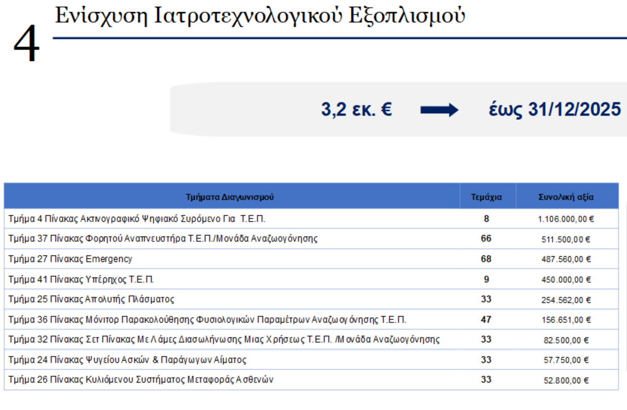 Ως προς τον προγραμματισμό του Υπουργείου Υγείας για την ενίσχυση των ΤΕΠ με ιατροτεχνολογικό εξοπλισμό και την ανανέωση των μηχανημάτων, υπάρχει η παρακάτω πρόβλεψη: