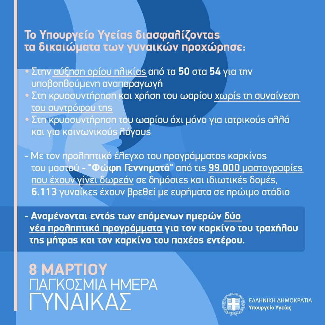 Εν συνεχεία παραθέτει τα ακόλουθα «βήματα» που λαμβάνει το υπουργείο Υγείας για να διασφαλίσει τα δικαιώματα των γυναικών: