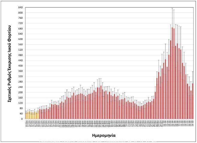 Στα διαγράμματα που παρουσιάζονται πιο κάτω, φαίνεται πως η διασπορά του ιού στην κοινότητα -παράλληλα με την επικράτηση του στελέχους Όμικρον- κορυφώθηκε στις 6 Ιανουαρίου, οπότε καταγράφηκε η υψηλότερη τιμή ιικού φορτίου από την αρχή της πανδημίας. Έκτοτε παρατηρείται μία σταδιακή μείωσή του, ενώ στις τέσσερις πιο πρόσφατες μετρήσεις καταγράφονται διακυμάνσεις, που ερμηνεύονται ως τάση σταθεροποίησης.