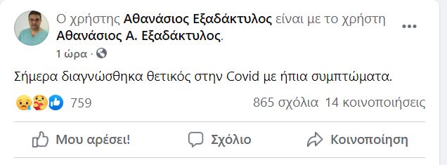 Ο Πρόεδρος του Πανελλήνιου Ιατρικού Συλλόγου (ΠΙΣ) και μέλος της Επιτροπής Εμπειρογνωμόνων του Υπουργείου Υγείας, Αθανάσιος Εξαδάκτυλος, είναι θετικός στον κορονοϊό, όπως αποκάλυψε ο ίδιος στον λογαριασμό του σε μέσο κοινωνικής δικτύωσης, προσθέτοντας ότι έχει ήπια συμπτώματα.