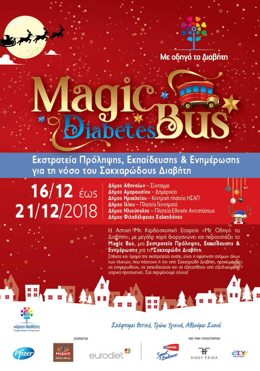 Από τις 16 έως και τις 21 Δεκεμβρίου 2018, το Diabetes Magic Bus της Αστικής Μη Κερδοσκοπικής Εταιρείας «Με Οδηγό το Διαβήτη», προσκαλεί τους μικρούς του φίλους και τους γονείς τους σε ένα μαγικό ταξίδι, που θα περιλαμβάνει: