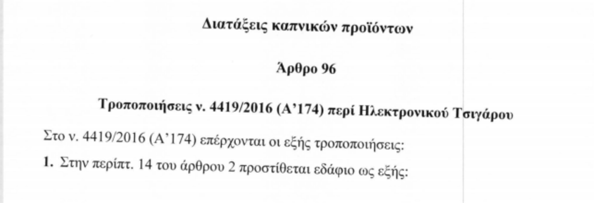 Με αυστηρούς όρους επιτρέπεται η κυκλοφορία στην ελληνική αγορά του ηλεκτρονικού τσιγάρου το οποίο δεν περιέχει νικοτίνη. Η σχετική διάταξη περιλαμβάνεται στο άρθρο 96 του νομοσχεδίου. Εξάλλου, με την παράγραφο 10 του άρθρου 96, συμπληρώνονται και εξειδικεύονται οι όροι συσκευασίας με σκοπό την αποτροπή ενδεχόμενων παρεκκλίσεων από τις υποχρεώσεις που υφίστανται σήμερα για τα νέα προϊόντα καπνού. Ενώ παράλληλα αναφέρεται ότι υπάρχουν πιθανοί κίνδυνοι στην υγεία από κάποια από τα συστατικά. Με τον τρόπο αυτό επεκτείνονται και στα ηλεκτρονικά τσιγάρα χωρίς νικοτίνη οι ρυθμιστικές διατάξεις που ισχύουν για τα νικοτινούχα.
