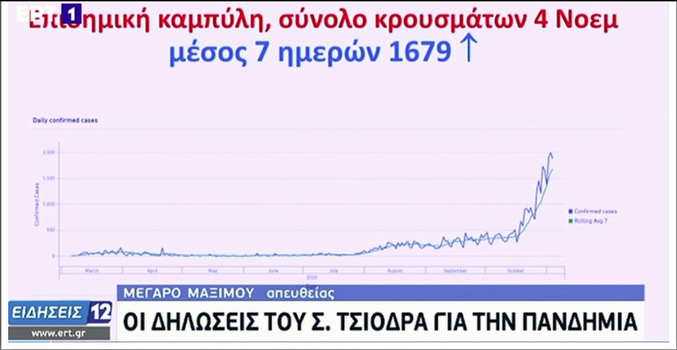 Κατακόρυφη είναι η αύξηση της επιδημικής καμπύλης από τις 26 Οκτωβρίου και μετά, λόγος που οδήγησε τη χώρα σε κατάσταση «κόκκινου» συναγερμού και σε δεύτερο lockdown, όπως ανέφερε παρουσιάζοντας σχετικά στοιχεία, ο καθηγητής παθολογίας και υπεύθυνος του υπουργείου Υγείας για τον κορονοϊό, Σωτήρης Τσιόδρας.