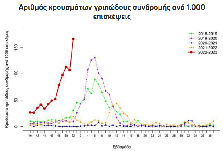 Σύμφωνα με την τελευταία επιδημιολογική έκθεση του ΕΟΔΥ, την προηγούμενη εβδομάδα οι επισκέψεις σε γιατρό ατόμων με γριπώδη συνδρομή (πυρετό, καταβολή, κεφαλαλγία, μυαλγίες), παρουσίασαν ρεκόρ πενταετίας.