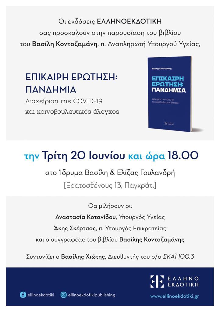 Η παρουσίαση του βιβλίου του Βασίλη Κοντοζαμάνη, που έχει τίτλο «Επίκαιρη Ερώτηση: Πανδημία, Διαχείριση της COVID-19 και Κοινοβουλευτικός Έλεγχος» θα γίνει την Τρίτη 20 Ιουνίου και ώρα 18.00, στο Ίδρυμα Βασίλη και Ελίζας Γουλανδρή (Ερατοσθένους 13, Παγκράτι).
