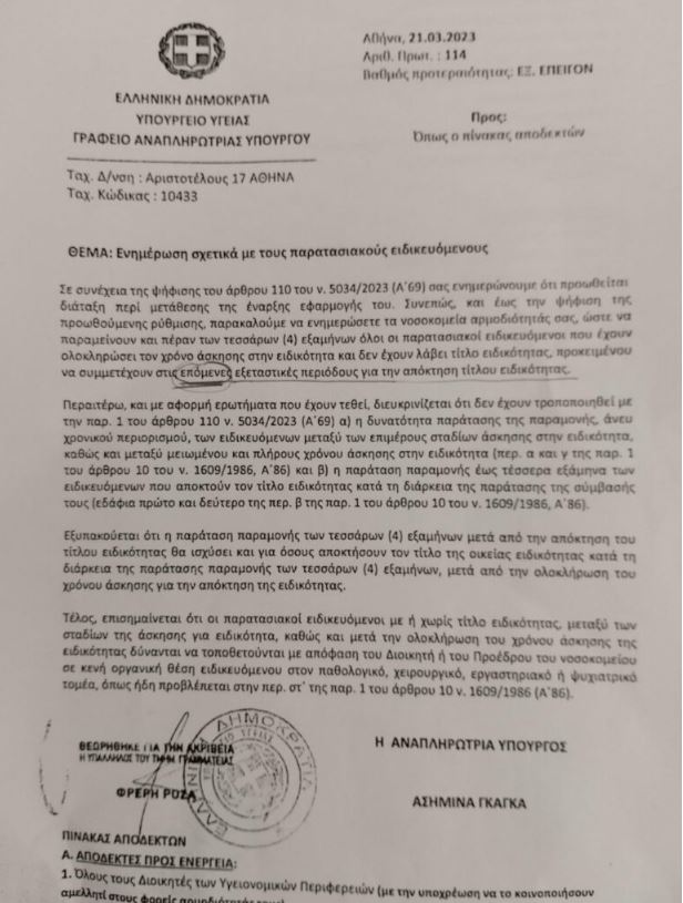 Συγκεκριμένα, στο έγγραφο αναφέρεται πως, προωθείται διάταξη περί μετάθεσης της έναρξης της εφαρμογής του νόμου και μέχρι τότε «ενημερώσετε τα νοσοκομεία αρμοδιότητάς σας ώστε να παραμείνουν και πέραν των τεσσάρων (4) εξαμήνων όλοι οι παρατασιακοί ειδικευόμενοι που έχουν ολοκληρώσει τον χρόνο άσκησης στην ειδικότητα και δεν έχουν λάβει τίλτο ειδικότητας, προκειμένου να συμμετέχουν στις επόμενες εξεταστικές περιόδους για την απόκλητηση τίτλου ειδικότητας».