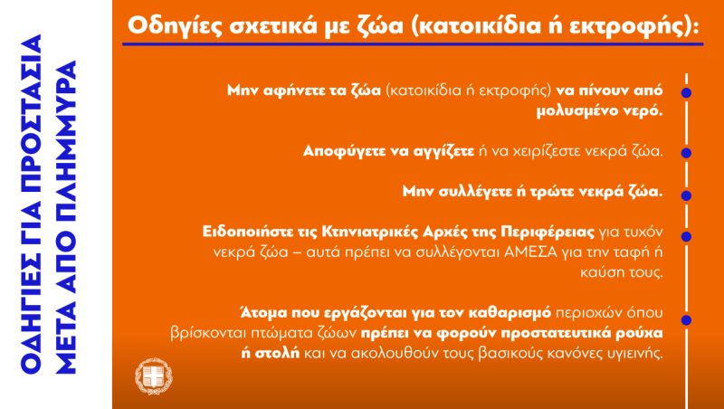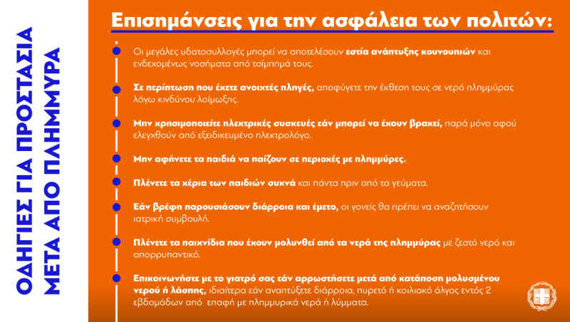 Οδηγίες για την κυκλοφορία των πολιτών σε πλημμυρισμένες περιοχές, τη διαχείριση των τροφίμων και του νερού, αλλά και τις έκτακτες ανάγκες, κοινοποίησε το Υπουργείο Υγείας σε γραφικά.
