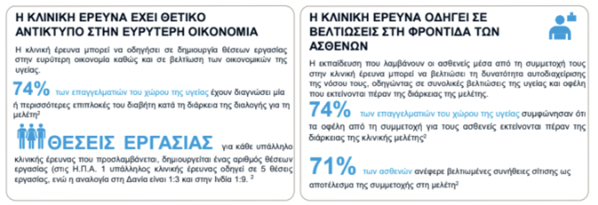 Παράλληλα οι κλινικές μελέτες δημιουργούν επενδύσεις και νέες θέσεις εργασίας, λόγω της εμπλοκής πολλών ενδιαφερομένων μερών στη διαδικασία διεξαγωγής τους. Στην Ελλάδα, για το διάστημα 2014 – 2018 έχουν πραγματοποιηθεί από την εταιρεία Novo Nordisk Hellas 17 κλινικές μελέτες, όπου συμμετείχαν 473 ασθενείς, ενώ η επένδυση για την υλοποίηση τους ξεπέρασε τα 6,9 εκατομμύρια ευρώ.3