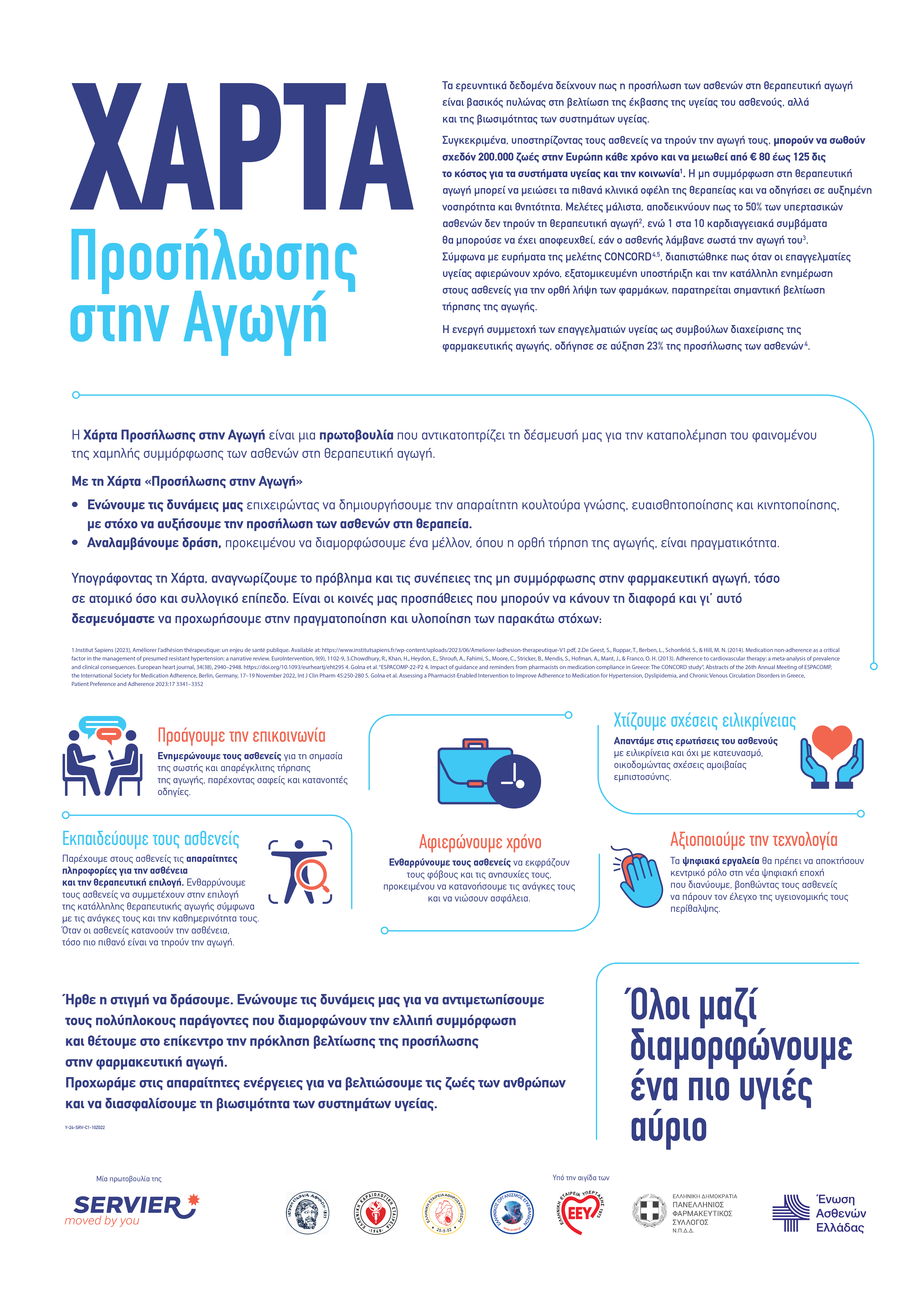 Υπογράφοντας τη Χάρτα, η Servier Hellas μαζί με τις Ιατρικές Εταιρείες, τον Πανελλήνιο Φαρμακευτικό Σύλλογο και την Ένωση Ασθενών Ελλάδος, ενώνουν τις δυνάμεις τους σε μια κοινή προσπάθεια και δεσμεύονται να προάγουν κοινές αρχές και πρακτικές που θα αντιμετωπίσουν τους πολύπλοκους παράγοντες που διαμορφώνουν την ελλιπή συμμόρφωση και θα ενισχύσουν την προσήλωση στην φαρμακευτική αγωγή.