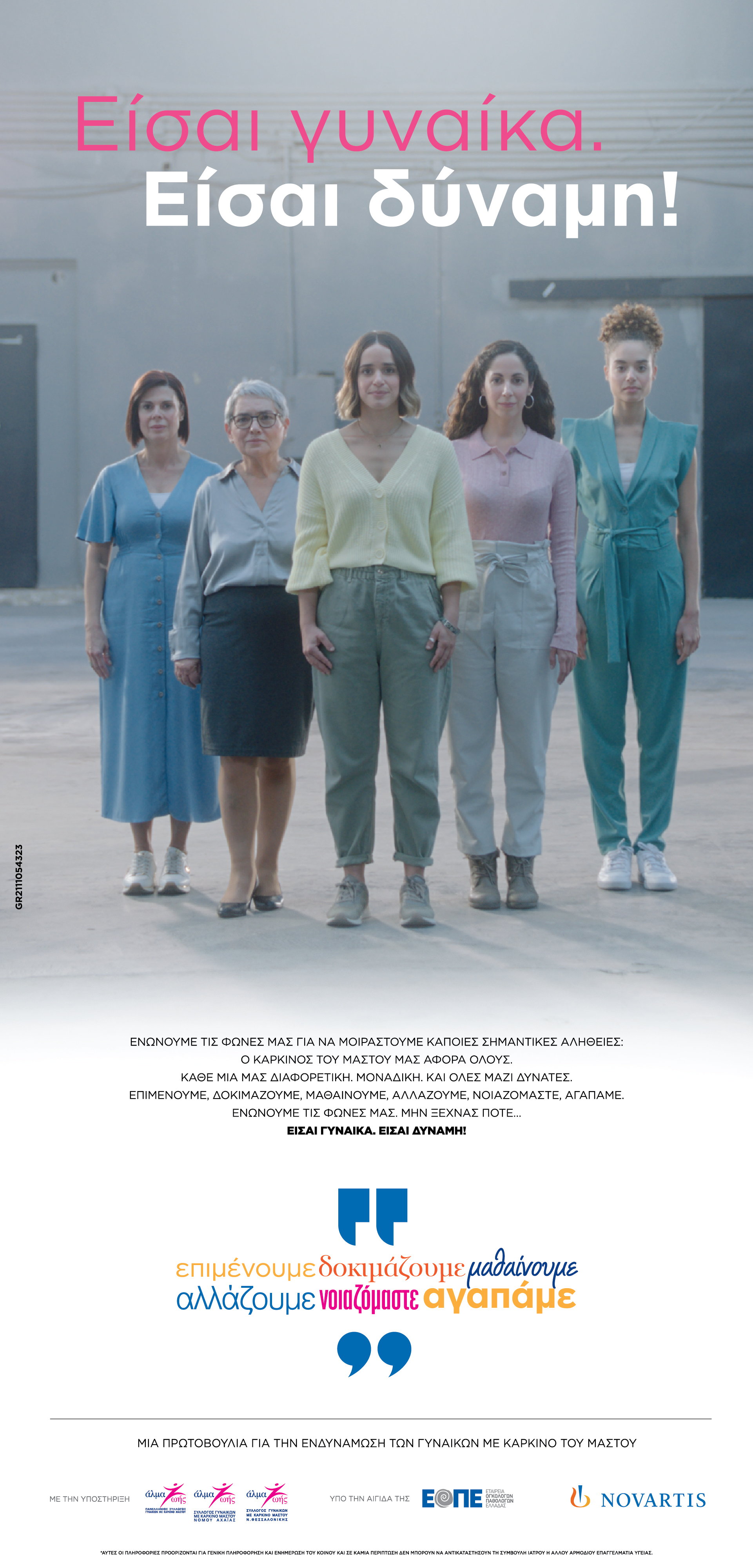 Η Novartis Hellas, πιστή στη δέσμευσή της για την υποστήριξη γυναικών που νοσούν ή έχουν νοσήσει με καρκίνο του μαστού, συνεχίζει και φέτος τον πέμπτο κύκλο της εκστρατείας «Είσαι γυναίκα. Είσαι δύναμη!», με κύριο όχημα την μουσική και με μια σύμπραξη-έκπληξη: Το φωνητικό σύνολο «Chόrεs», ένα αμιγώς γυναικείο φυτώριο καλλιτεχνών, ηλικίας 13-55 ετών που ιδρύθηκε το 2017 από τη Μαρίνα Σάττι και αναβιώνει παραδοσιακά τραγούδια με το δικό τους μοναδικό τρόπο, δημιουργούν το δικό τους μήνυμα αλληλοϋποστήριξης και γυναικείας ενδυνάμωσης.